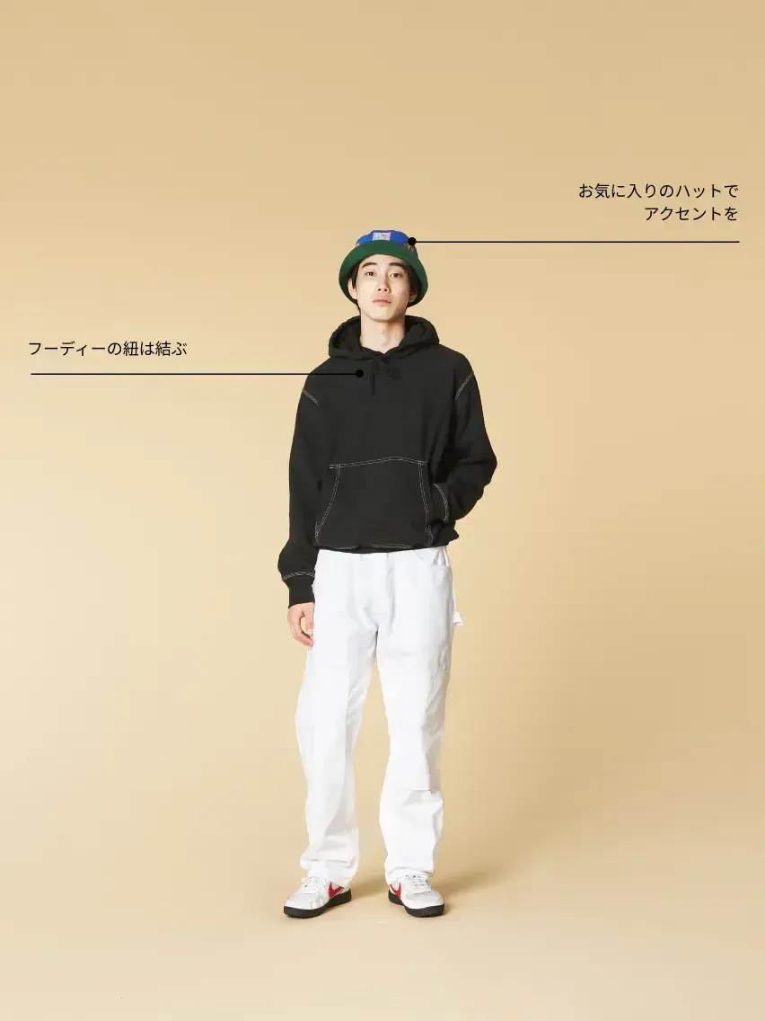 リラックスした重厚なストリートスタイルに仕上げるなら「2サイズアップ」がおすすめです。