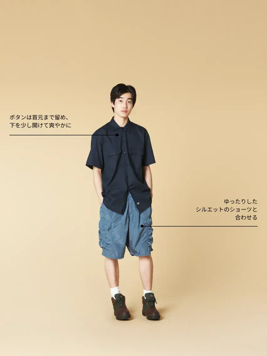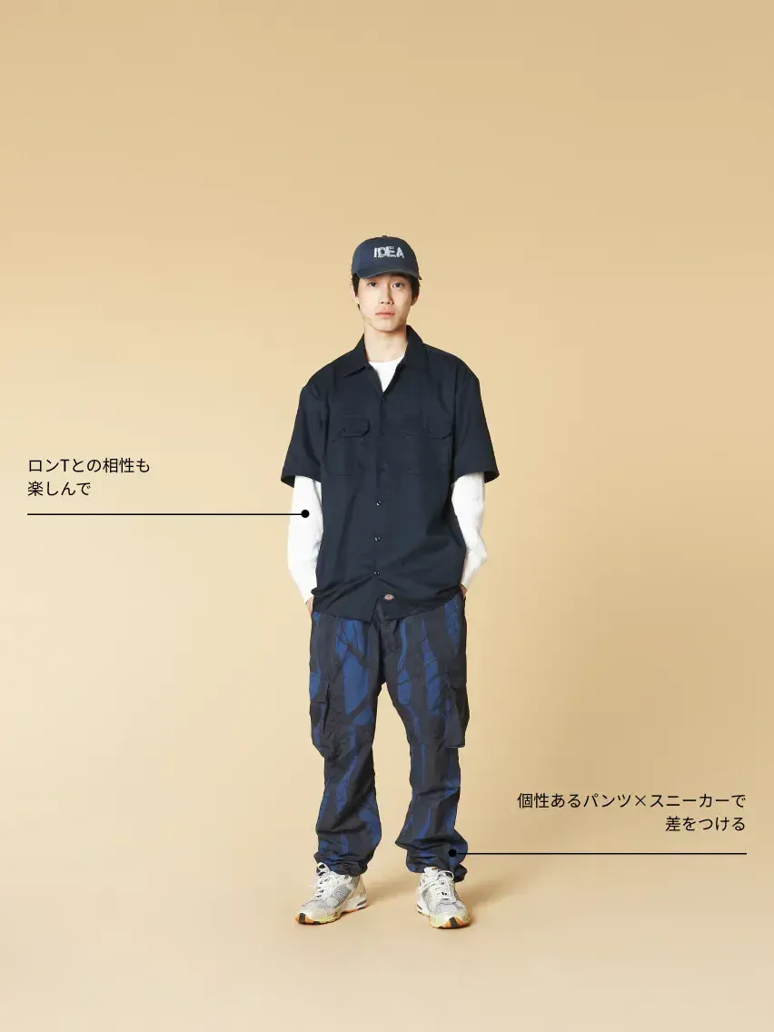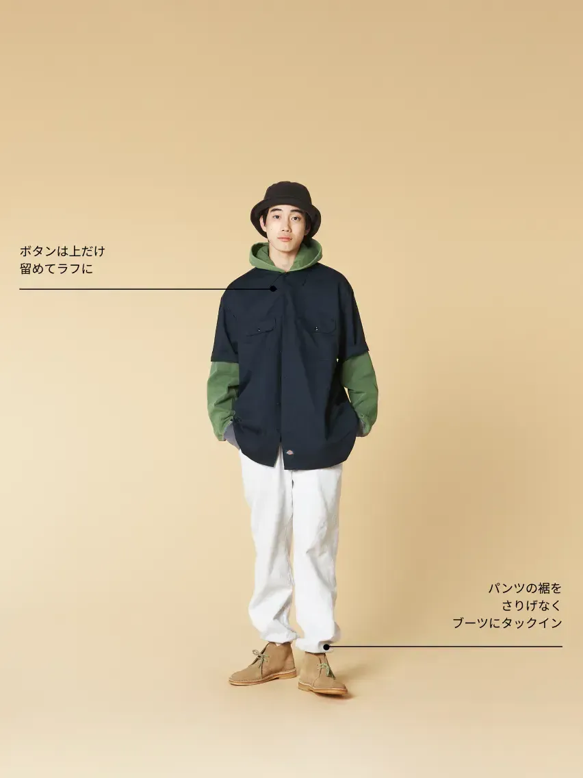 肩と胸にゆとりを持たせ、タックでもノータックでも着られるように長めに設計されたデザインです。 ワークシャツとオリジナル874ワークパンツの組み合わせでセットアップのようなスタイリングも楽しめます。