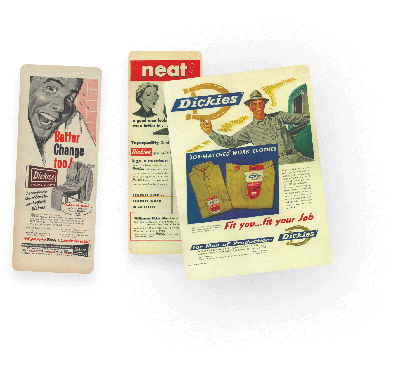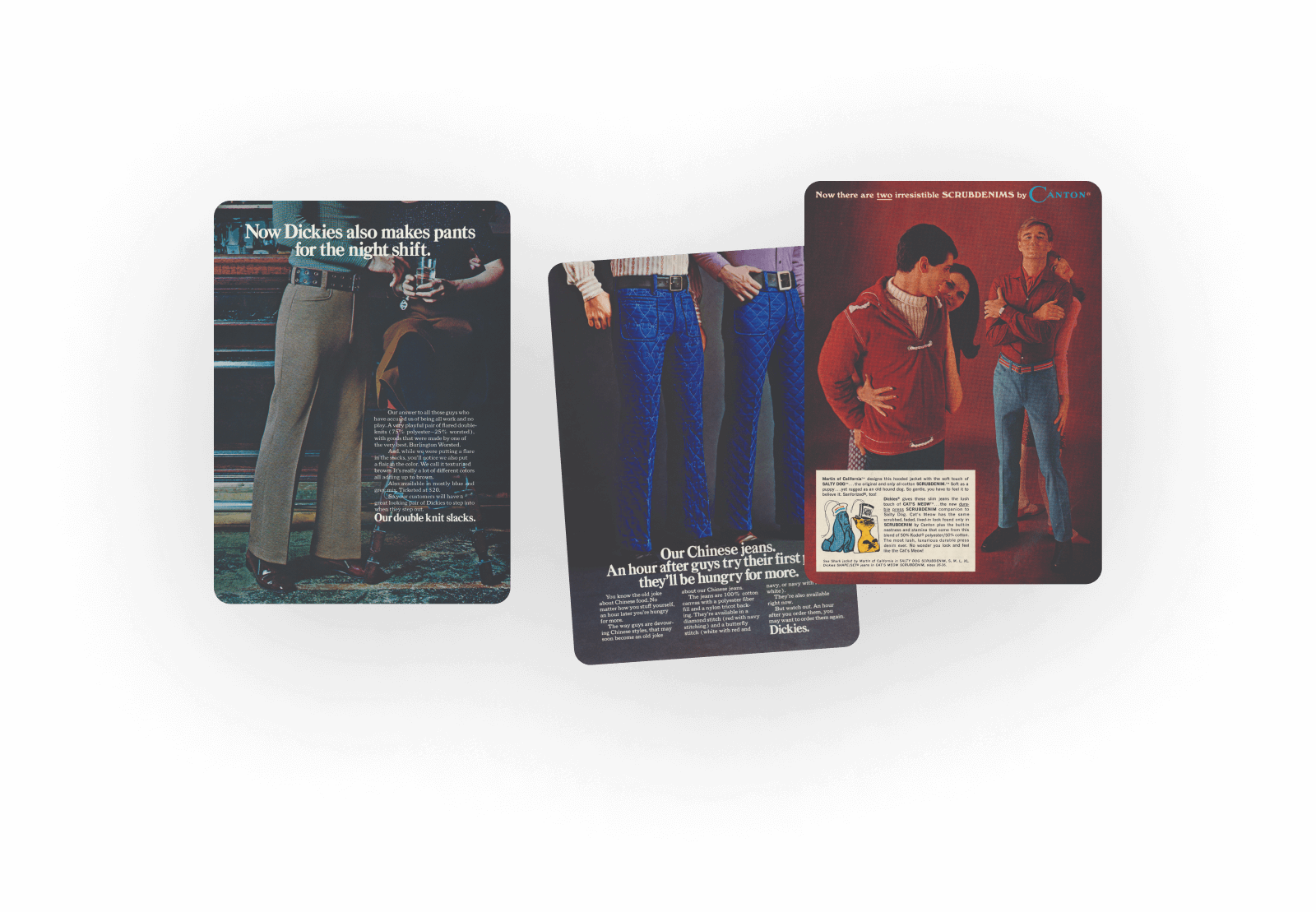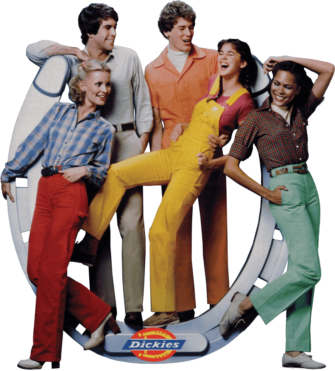 1970年代末~80年代になると、アメリカに自由で開放的な空気が流れ始め、ディッキーズをワークウェアとしてではなく、ファッションとして着用する人々も登場。そのニーズに応えるべく、大胆な色使いのアイテムなどを次々と発表し始めた。